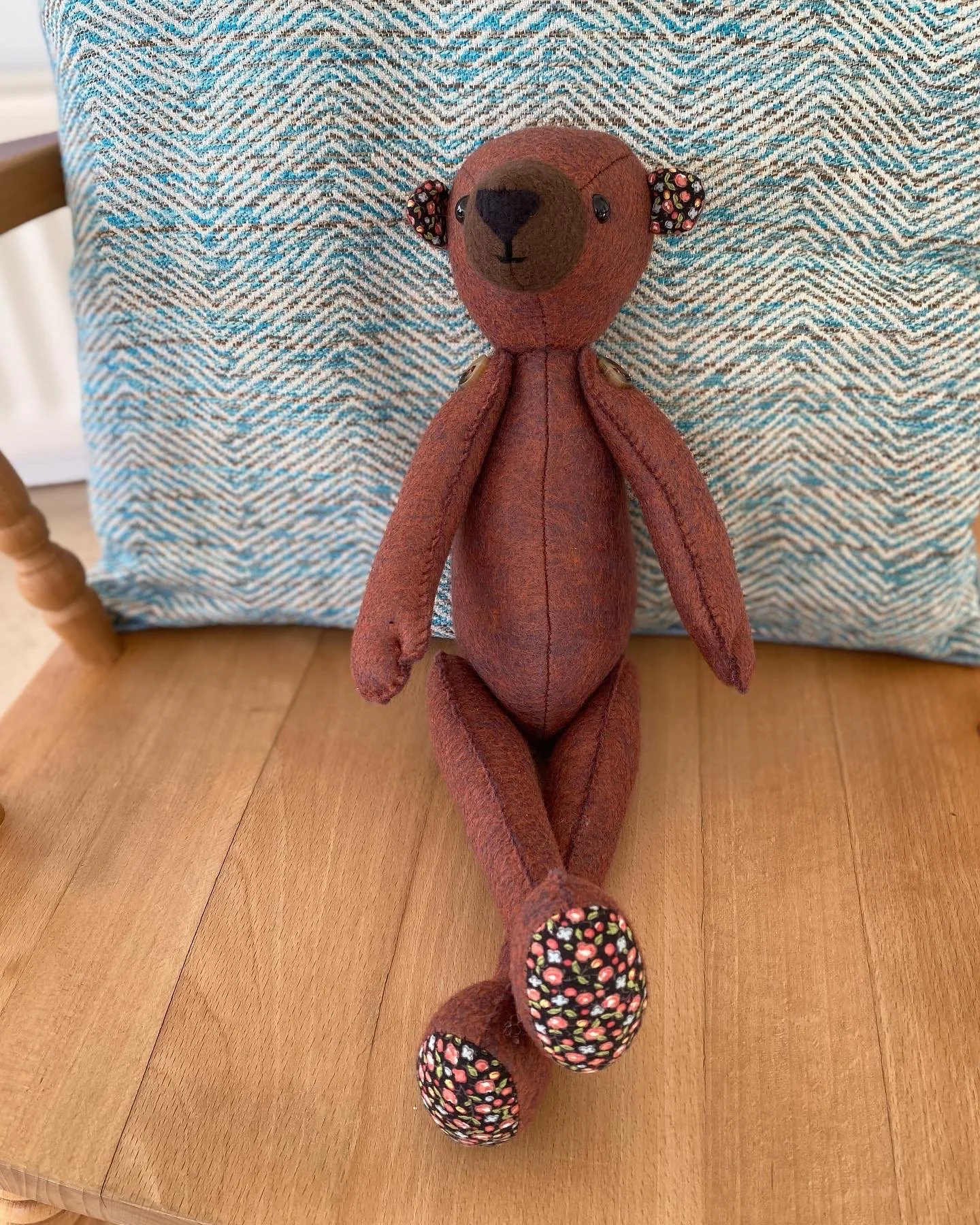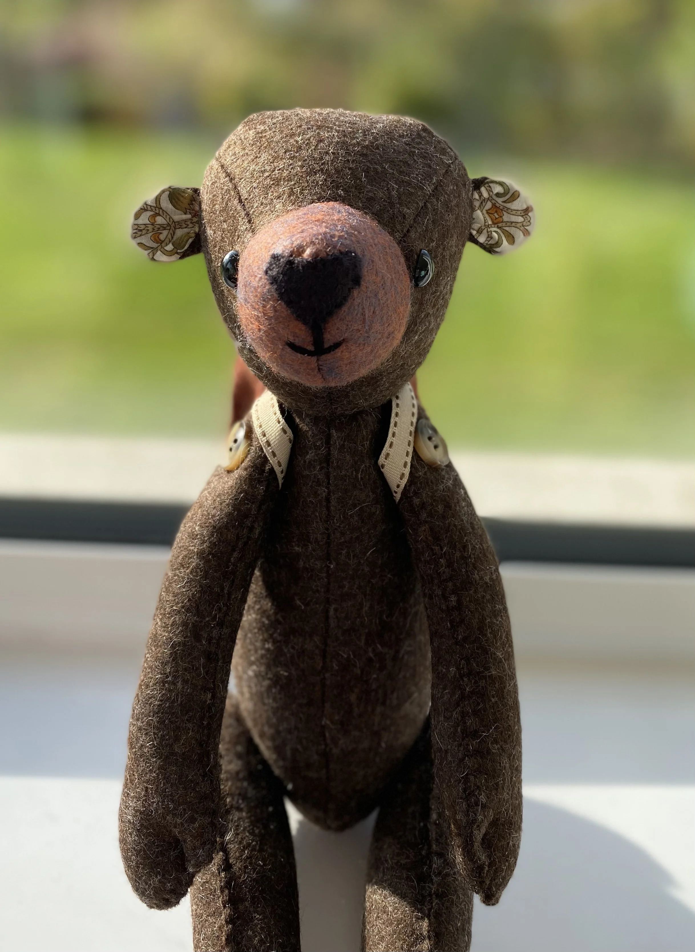 Hand sewn body made from dark brown pure wool felt. Muzzle in contrasting brown with black felt snout, domed black button eyes. Inner ears and paw pads in complementary ditsy print cotton fabric.