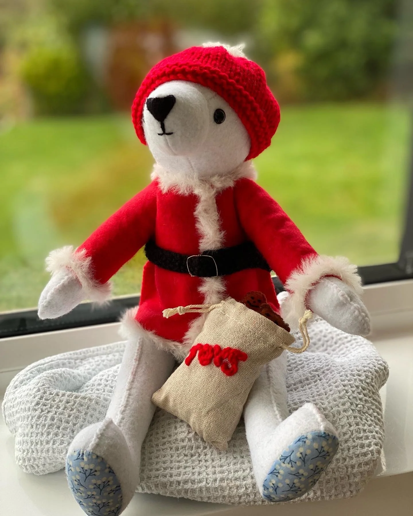 Dressed in Santa tunic - hand sewn from felt and trimmed with faux fur. Black belt and red hat with pompom complete the look.